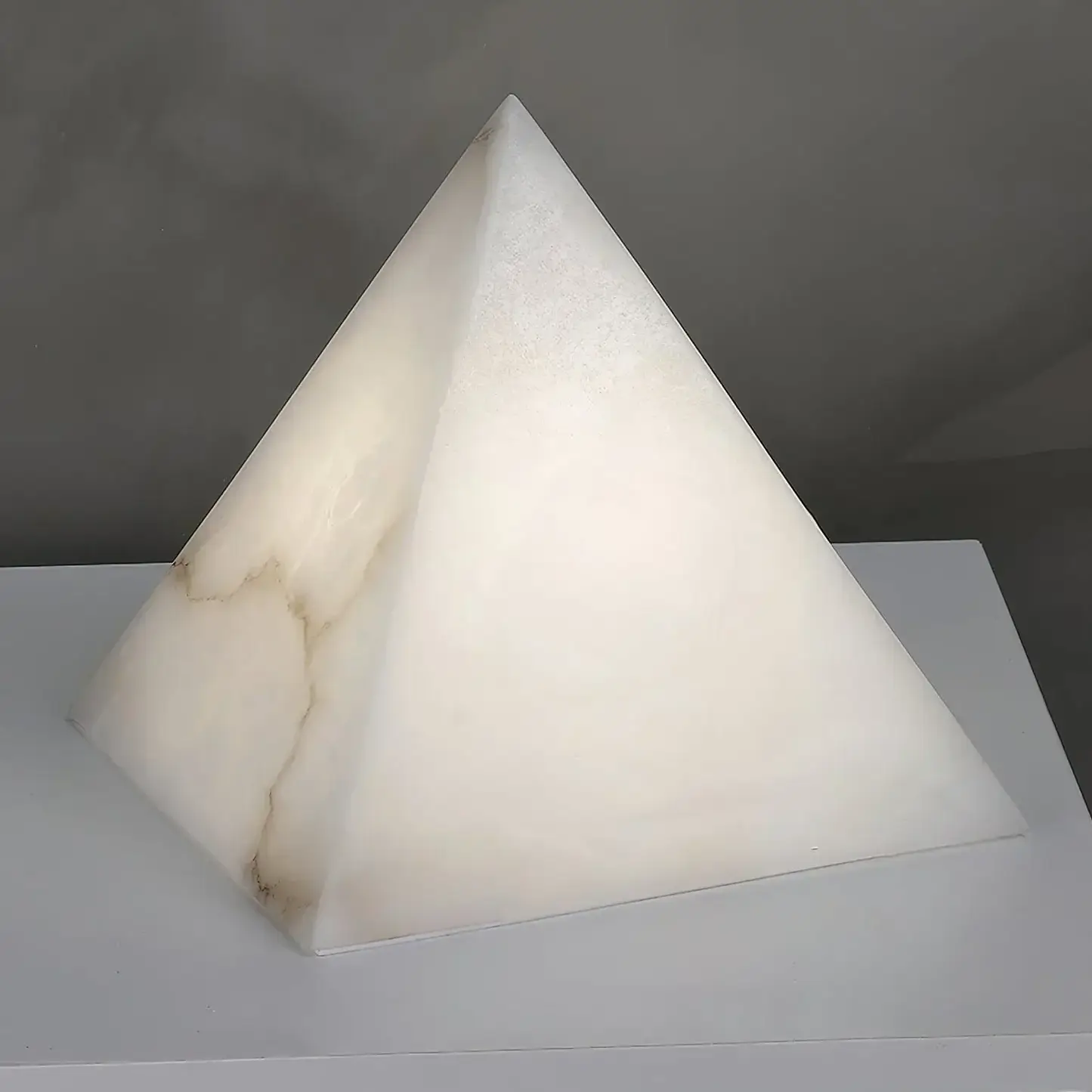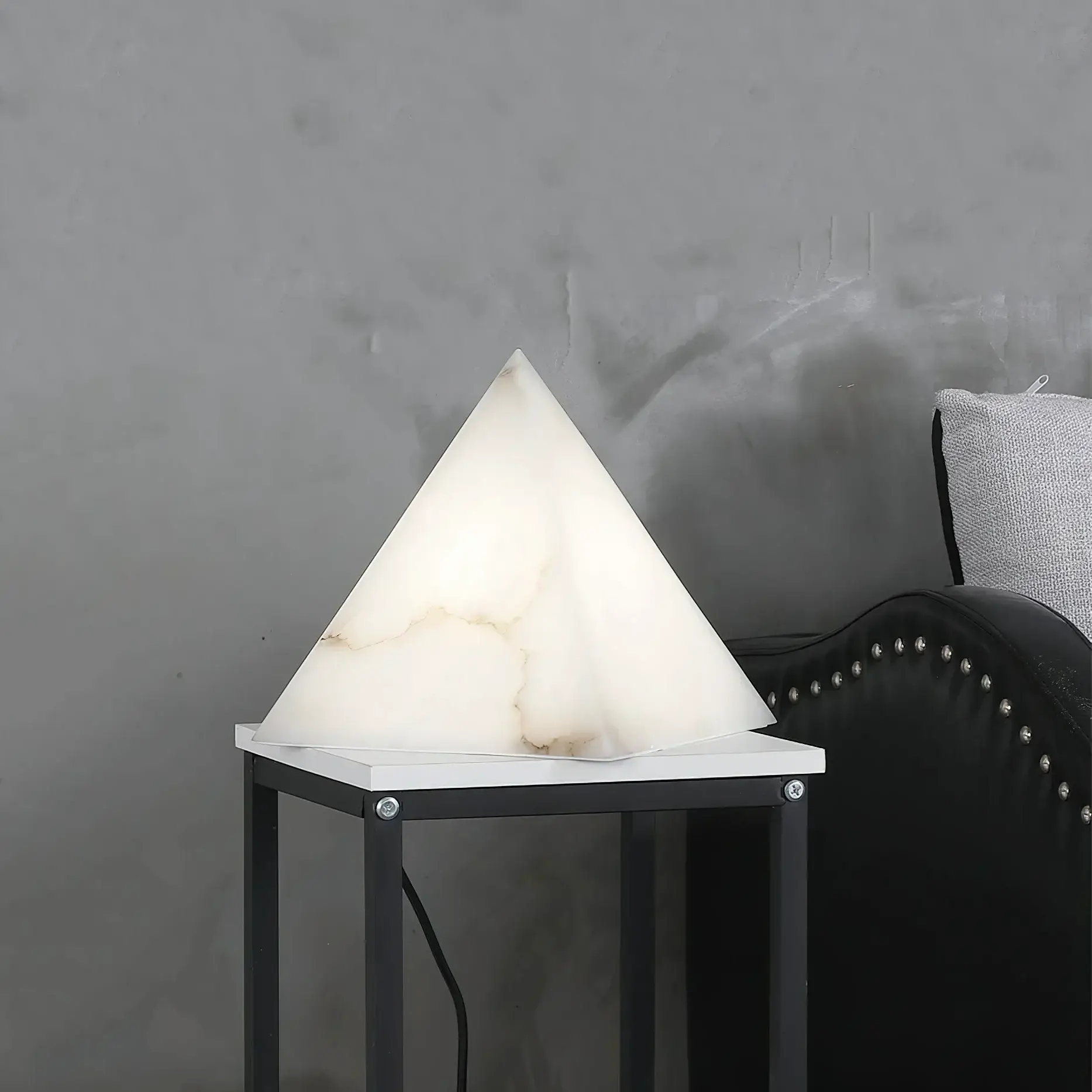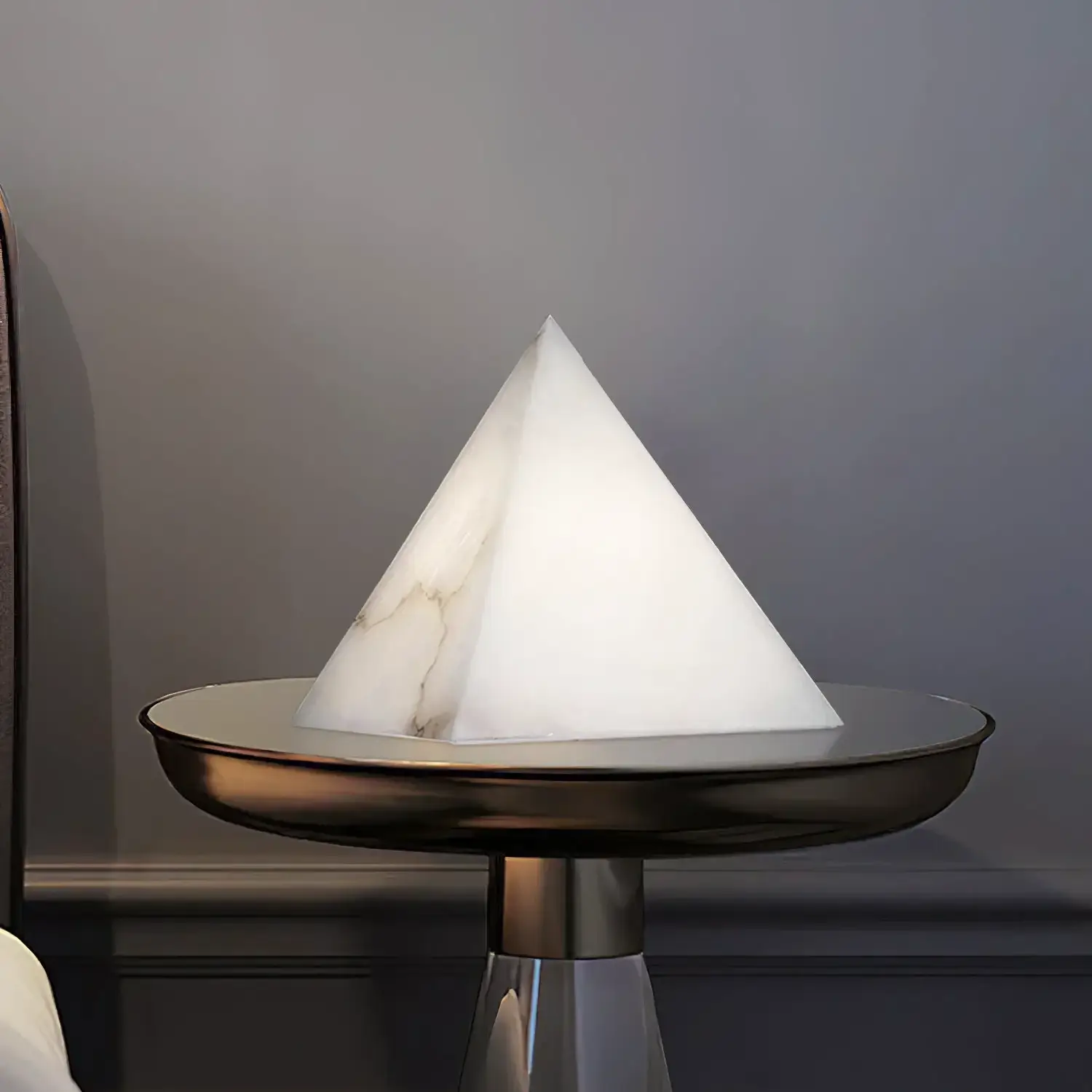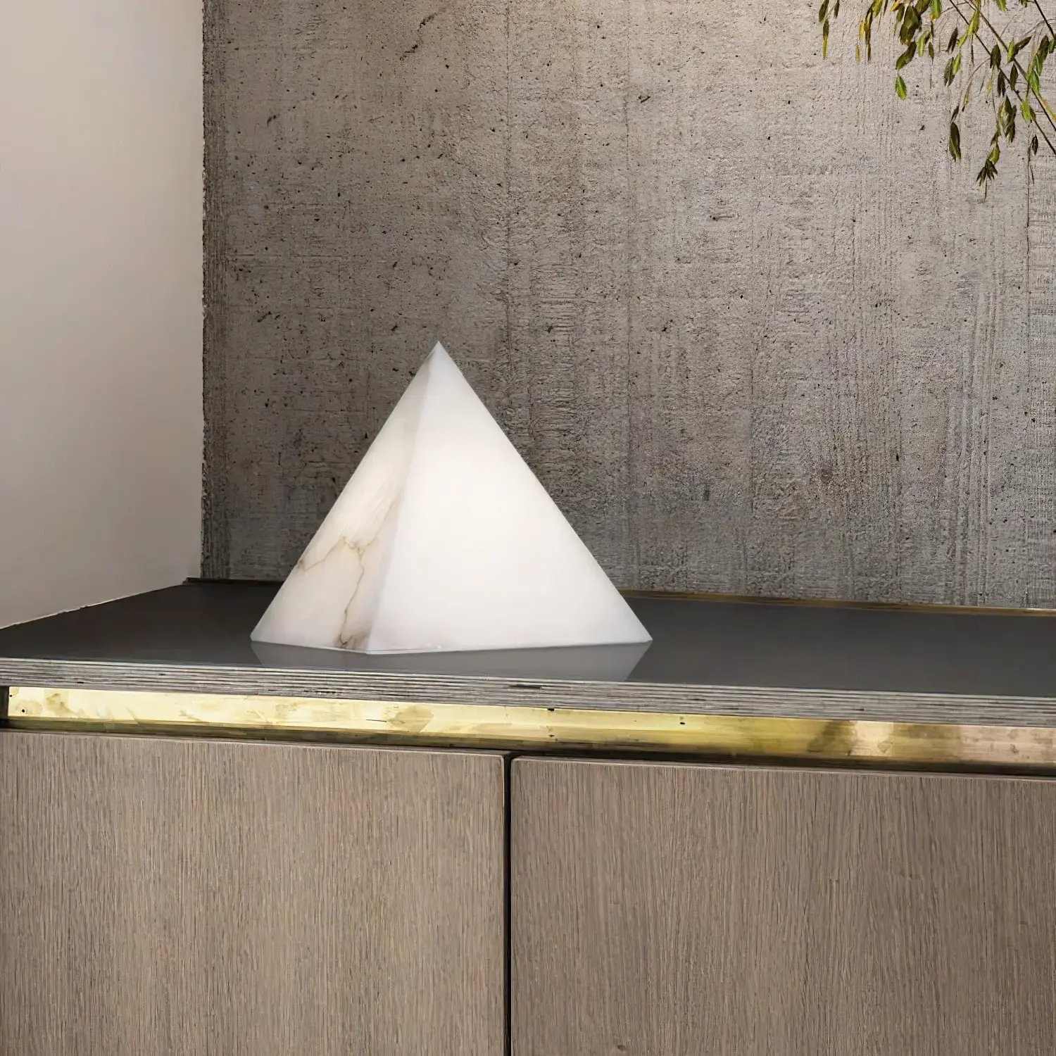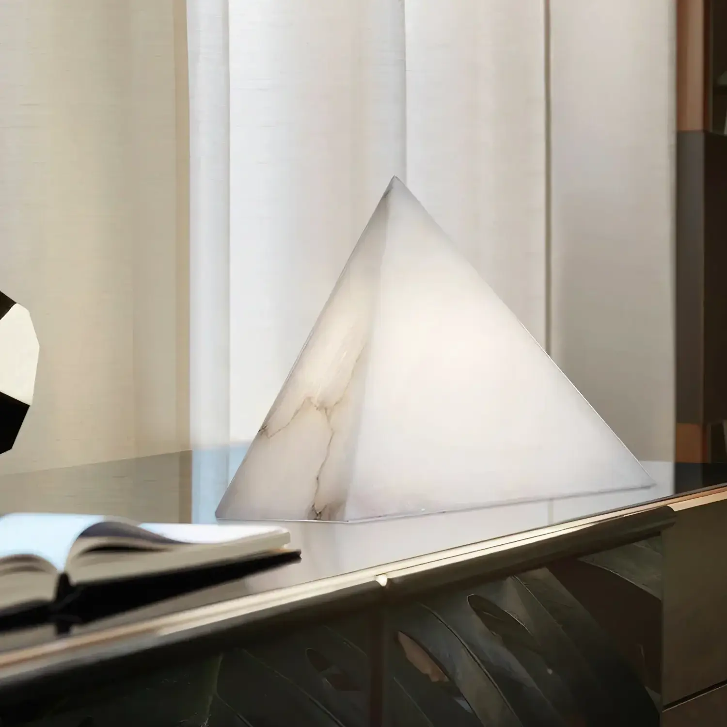 This alabaster pyramid table lamp is an artistic piece that combines geometric aesthetics with natural luxury. The lampshade is carved from a single block of alabaster in a pyramid shape, with a metal tray at the base. When the light is on from within, the translucent alabaster softly emits a warm glow, clearly showcasing the natural marble texture, adding an elegant and tranquil atmosphere to any modern or classic space.