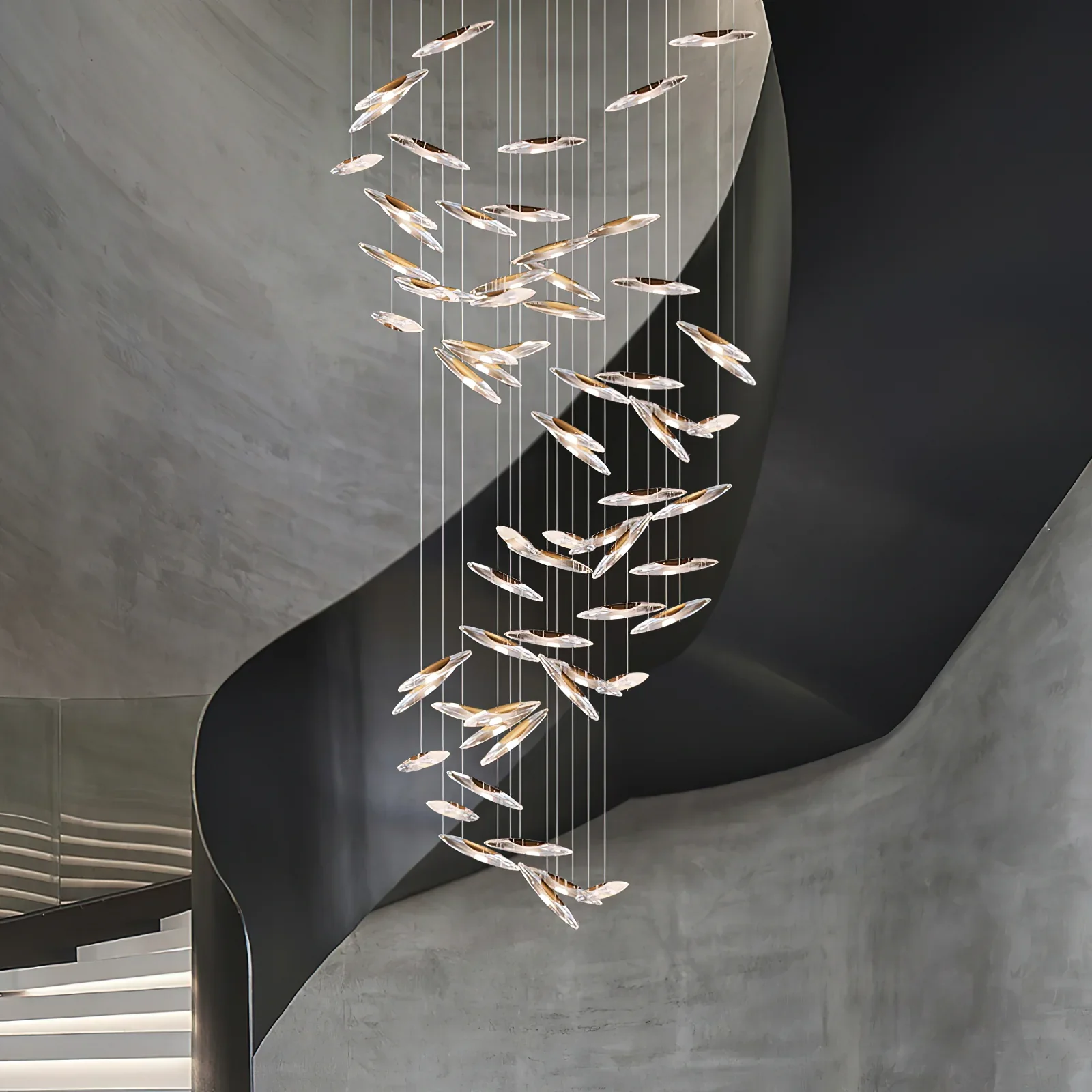 It features numerous streamlined, glass elements resembling small fish, suspended by thin wires. These elements are illuminated to create a dynamic, shimmering effect, like a school of fish swimming or a cascade of light. It is designed for high-end, contemporary spaces with tall ceilings.