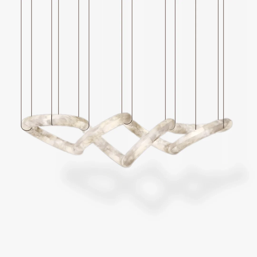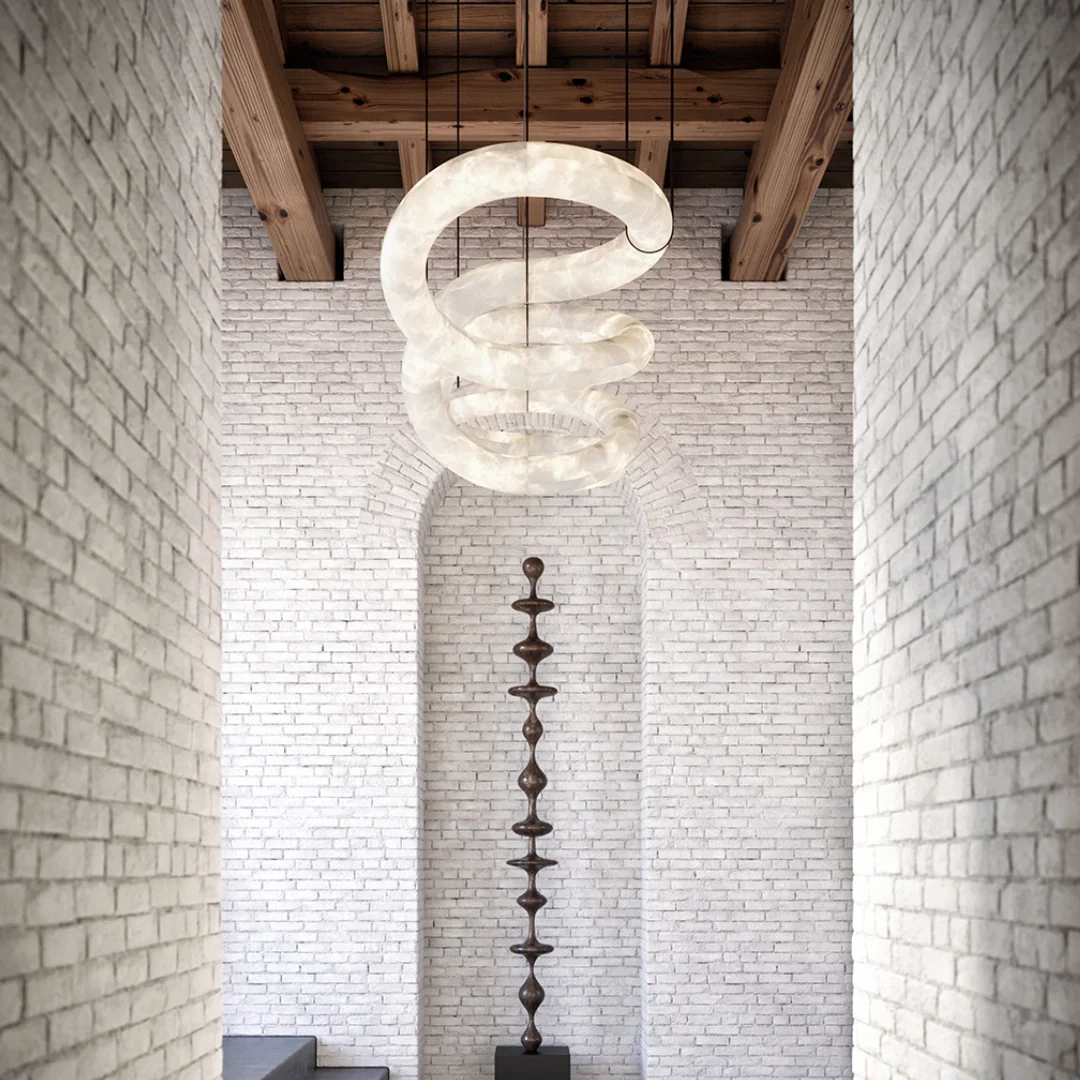 This “Infinite Glow Alabaster Chandelier” is presented in the form of an infinitely looping chain, composed of interwoven tubular structures resembling alabaster, and suspended using a belt-and-wire suspension system. Its lighting creates a soft halo through the material, and the design exudes a modern artistic feel, making it suitable for industrial or minimalist restaurants or art spaces, serving both lighting and decorative functions.
