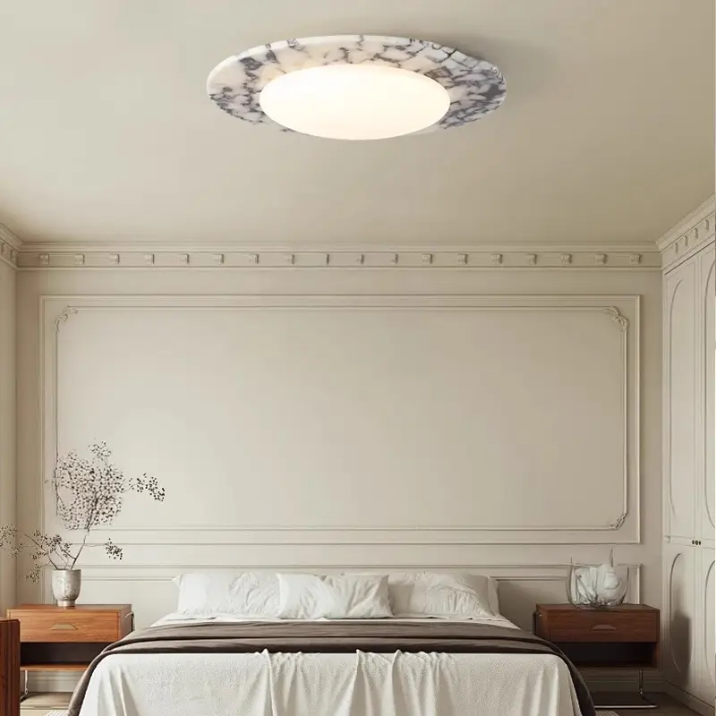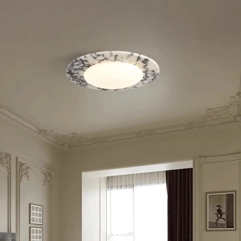 This “Italian Marble Ceiling Lamp” is a round ceiling light with an outer ring made of Italian marble, showcasing a natural black and white interwoven texture for a sophisticated feel. The central circular light-emitting area provides soft illumination. The overall design combines the understated luxury of marble with the functionality of the lighting fixture, making it suitable for European and minimalist luxury décor styles, adding elegance and an artistic atmosphere to any space.
