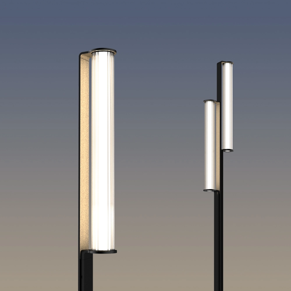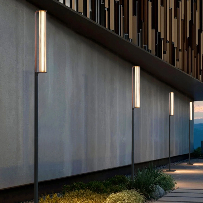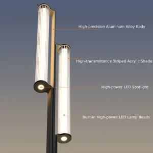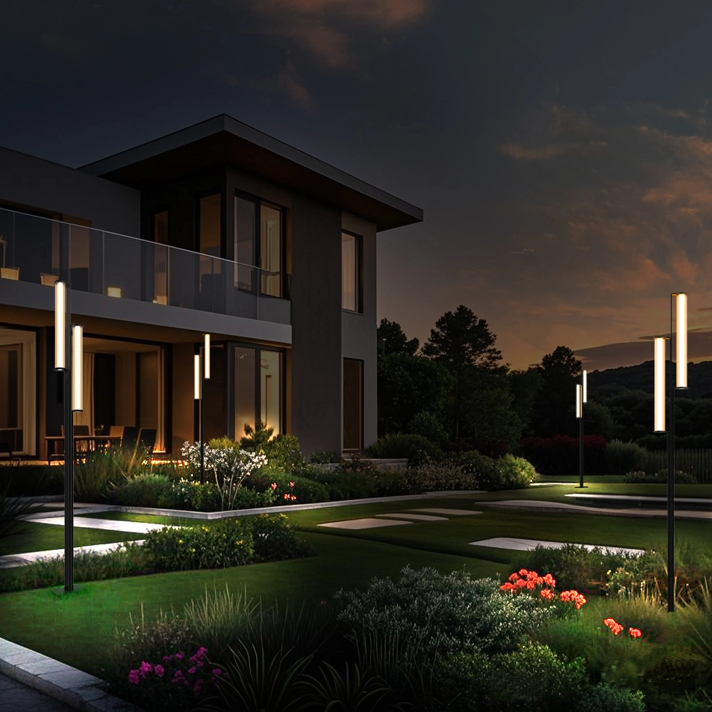 This Outdoor Garden Landscape Lamp features a sleek, modern design with a tall, slender metal pole. It comes in single-head and double-head styles, with a cylindrical light fixture that emits a warm glow. Suitable for outdoor spaces like gardens and poolside, it combines functionality with aesthetic appeal, enhancing the landscape with its elegant and contemporary look while providing gentle illumination.