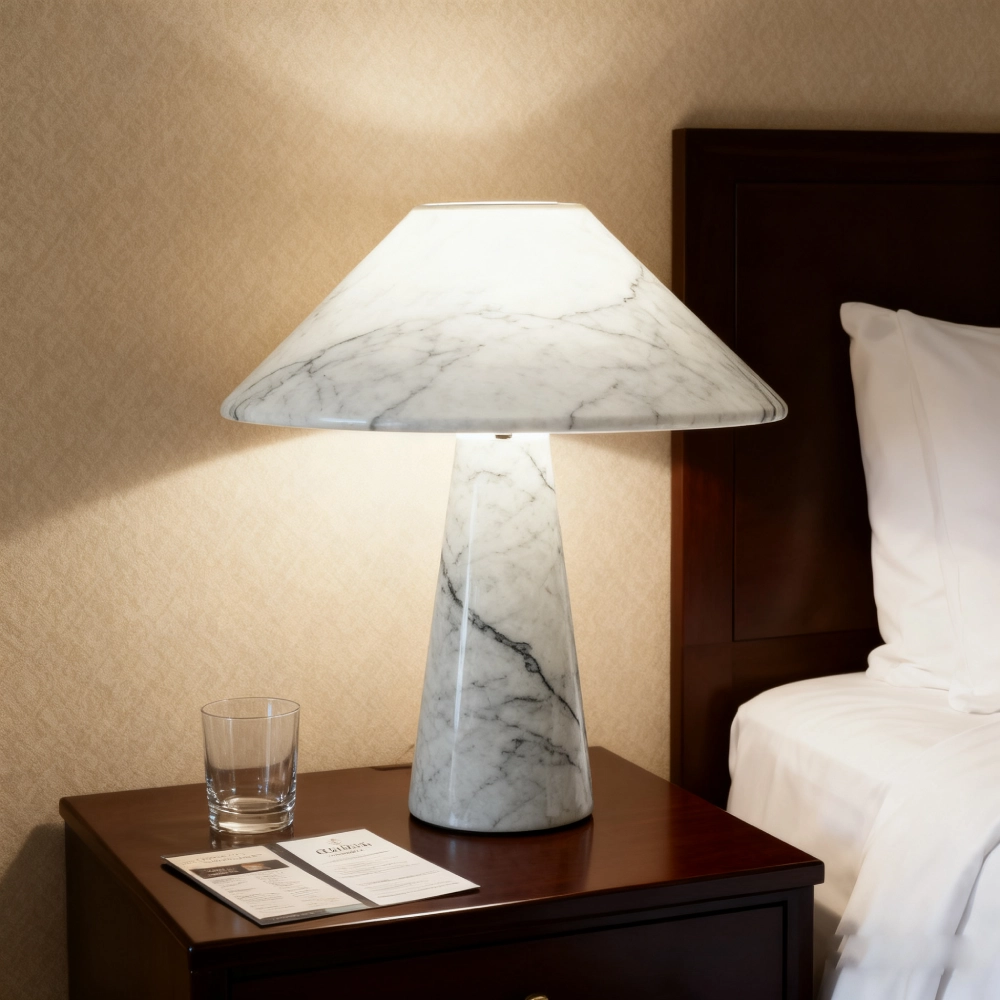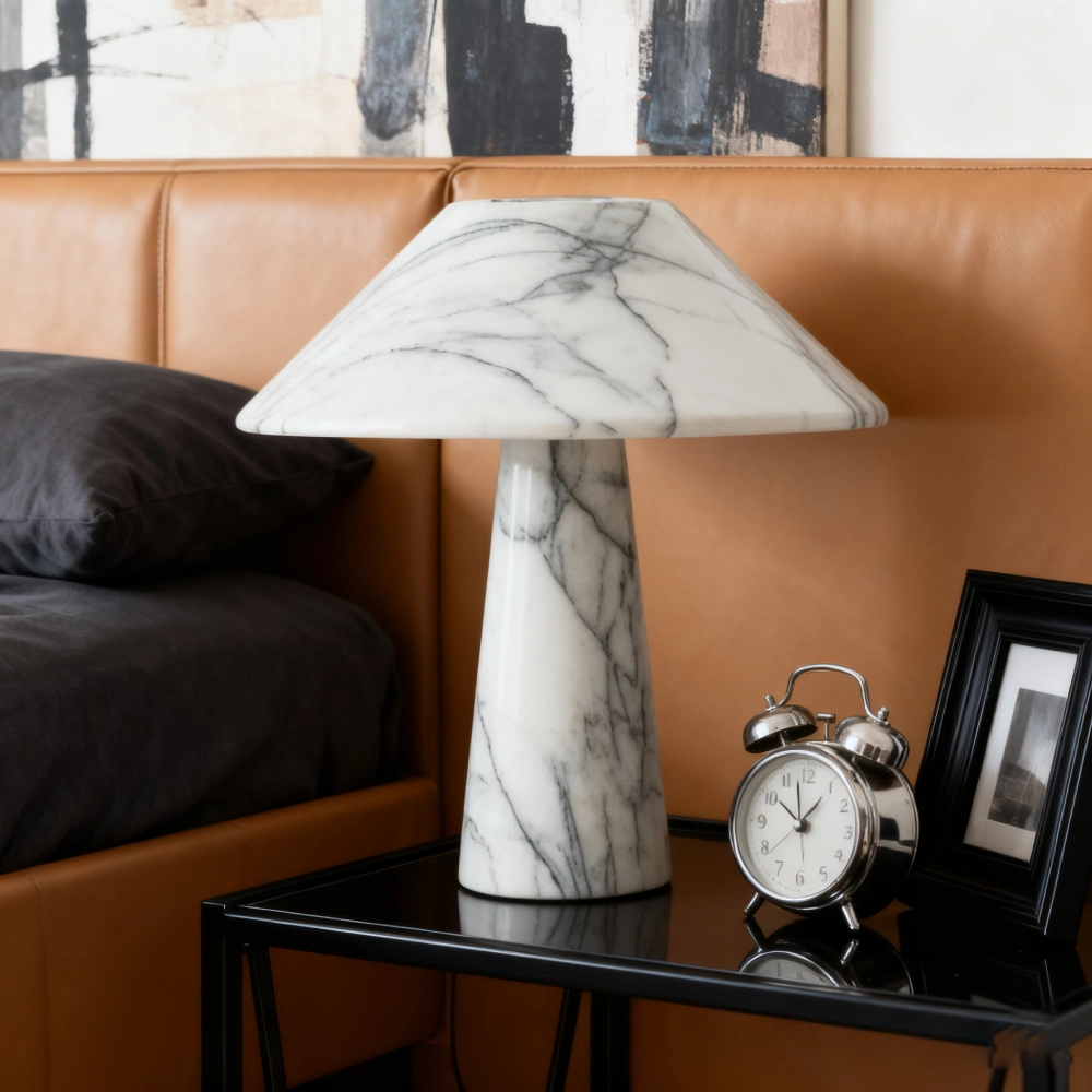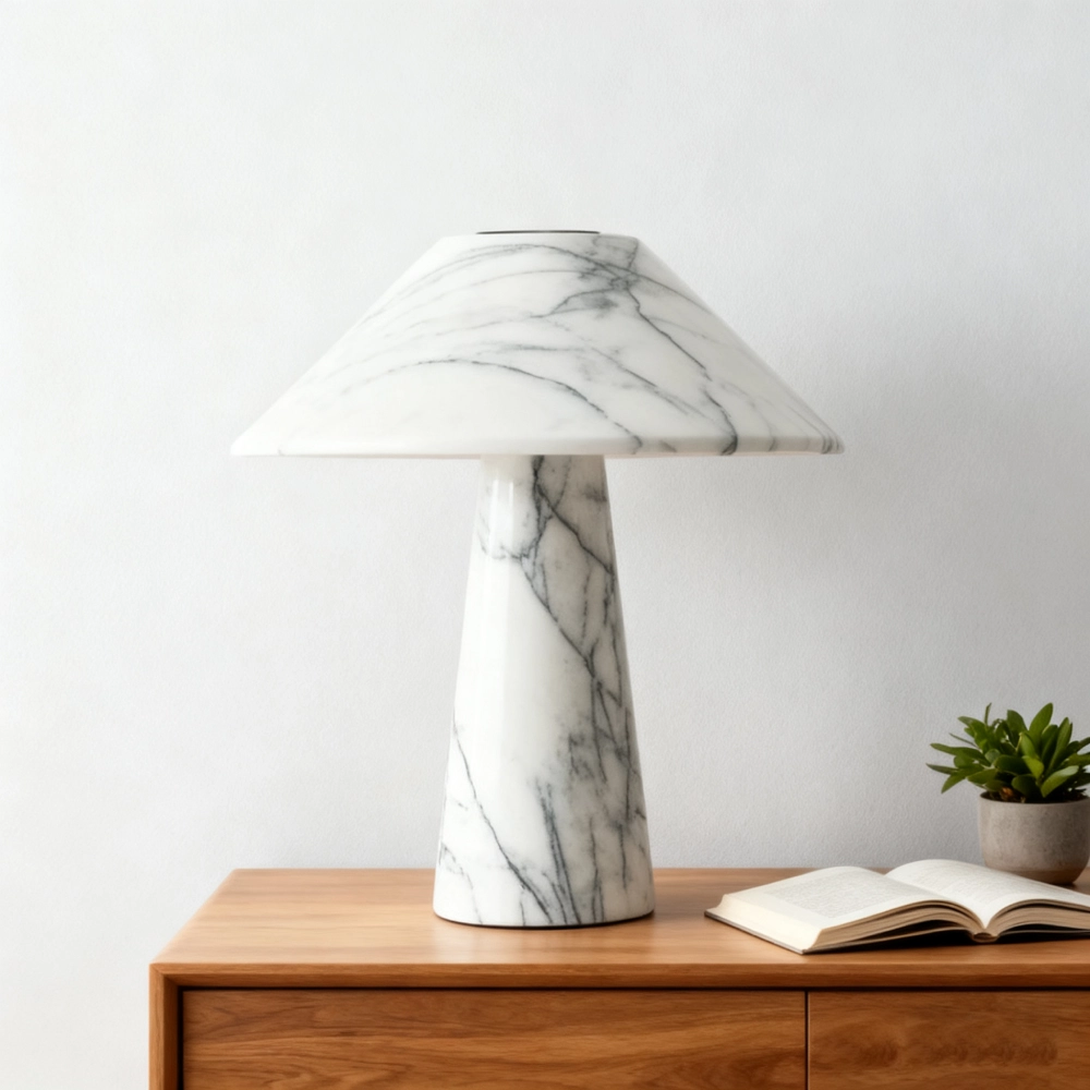 The White Marble Table Lamp features a sleek cylindrical marble base with a smooth, natural texture. Its minimalist design combines luxury and simplicity, making it a perfect accent for modern interiors. The lamp emits a warm and soft glow, ideal for bedside tables, living rooms, or offices.